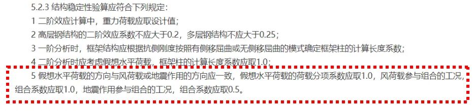 《鋼結(jié)構(gòu)通用規(guī)范》5.2.3-5:假想水平力分項系數(shù)為1.0,與風組合時,組合值系數(shù)為1.0,與地震組合時,組合值系數(shù)為0.5。