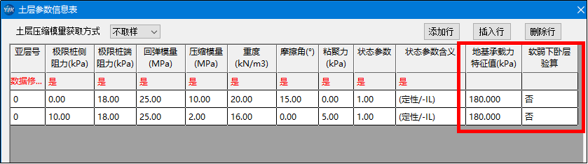 在地質(zhì)資料中的土層參數(shù)表后部增加兩列新的參數(shù)列:地基承載力特征值與是否進行軟弱下臥層驗算。當選擇【是】時,軟件將會根據(jù)此處輸入的地基承載力特征值進行驗算。